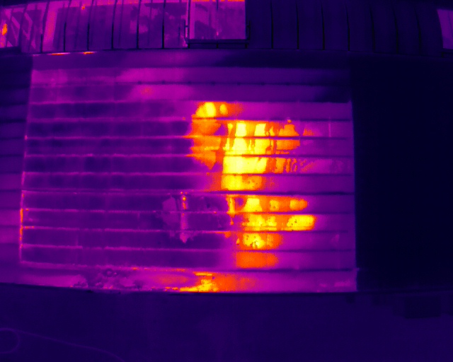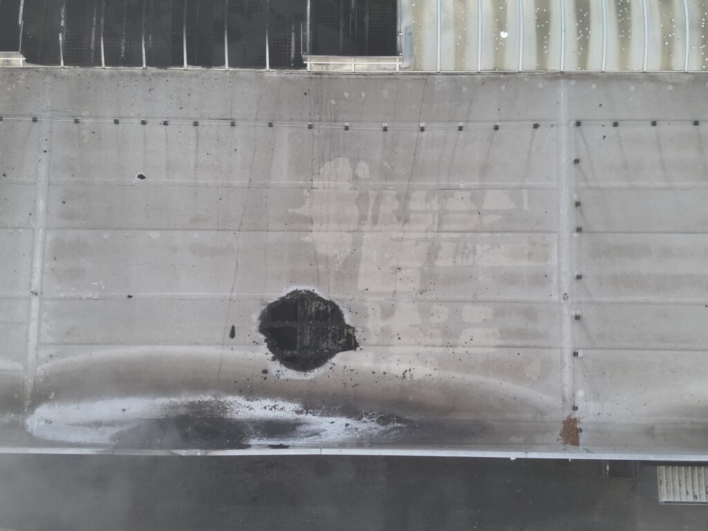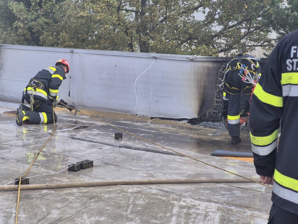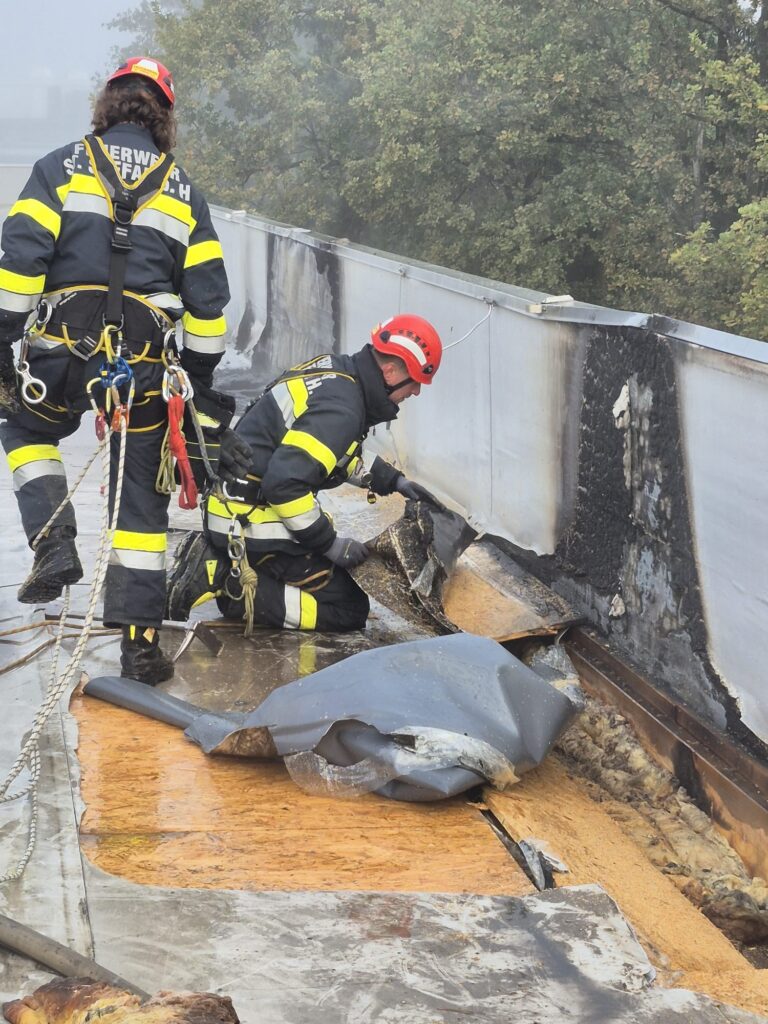 Da sich das Feu­er bereits auf die Dach­haut aus­ge­brei­tet hat­te, war es not­wen­dig, die­se über die Dreh­lei­ter Völ­ker­markt zu öff­nen. Auf­grund der zuneh­men­den Insta­bi­li­tät der Dach­kon­struk­ti­on kam zusätz­lich die MRAS-Ein­heit (Men­schen­ret­tung und Absturz­si­che­rung) zum Ein­satz, um die ein­ge­setz­ten Kräf­te bei der Arbeit am Dach ent­spre­chend zu sichern.