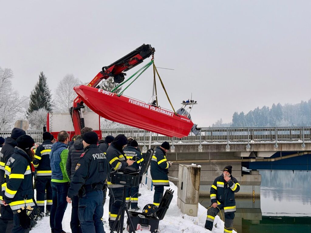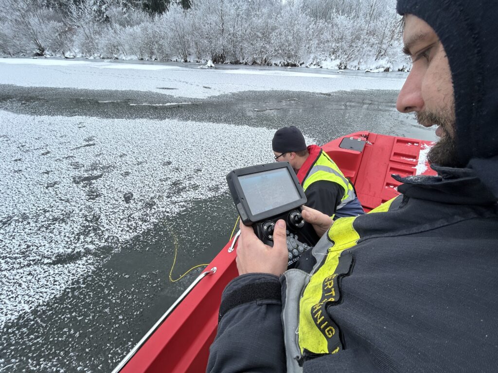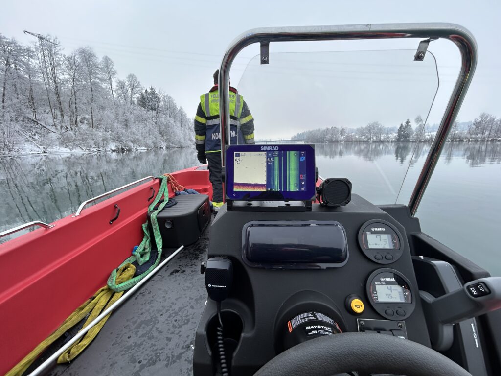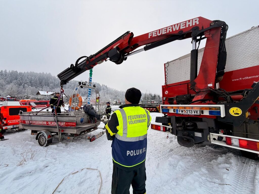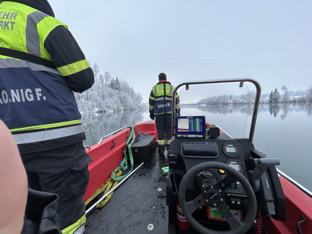 Als ers­tes Boot am Was­ser wur­de mit dem neu­en Boot mit­tels Side­scan-Sonar der Ufer­be­reich abge­sucht. In wei­te­rer Fol­ge wur­de auch das Boot der Berufs­feu­er­wehr Kla­gen­furt zu Was­ser gelas­sen, wel­ches die Suche unter­stütz­te. Die Unter­was­ser­droh­ne der Feu­er­wehr Perat­s­chit­zen, die bereits vor dem Ein­tref­fen der Boo­te den Ufer­be­reich abge­sucht hat­te, wur­de auf eines unse­rer Boo­te ver­la­den. Gemein­sam wur­de anschlie­ßend auch der Bereich unter den Eis­schol­len sys­te­ma­tisch abgesucht.