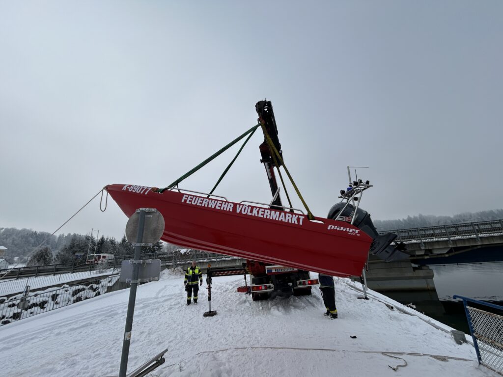 Die Feu­er­wehr Völ­ker­markt rück­te mit dem schwe­ren Kran­fahr­zeug (SRF‑K) sowie allen drei Boo­ten aus. Auf­grund der star­ken Ver­ei­sung der bekann­ten Slip­stel­len war ein siche­res Slip­pen der Boo­te nicht mög­lich. Daher muss­ten die Boo­te mit­hil­fe des SRF‑K direkt an der Ein­satz­stel­le zu Was­ser gelas­sen werden.